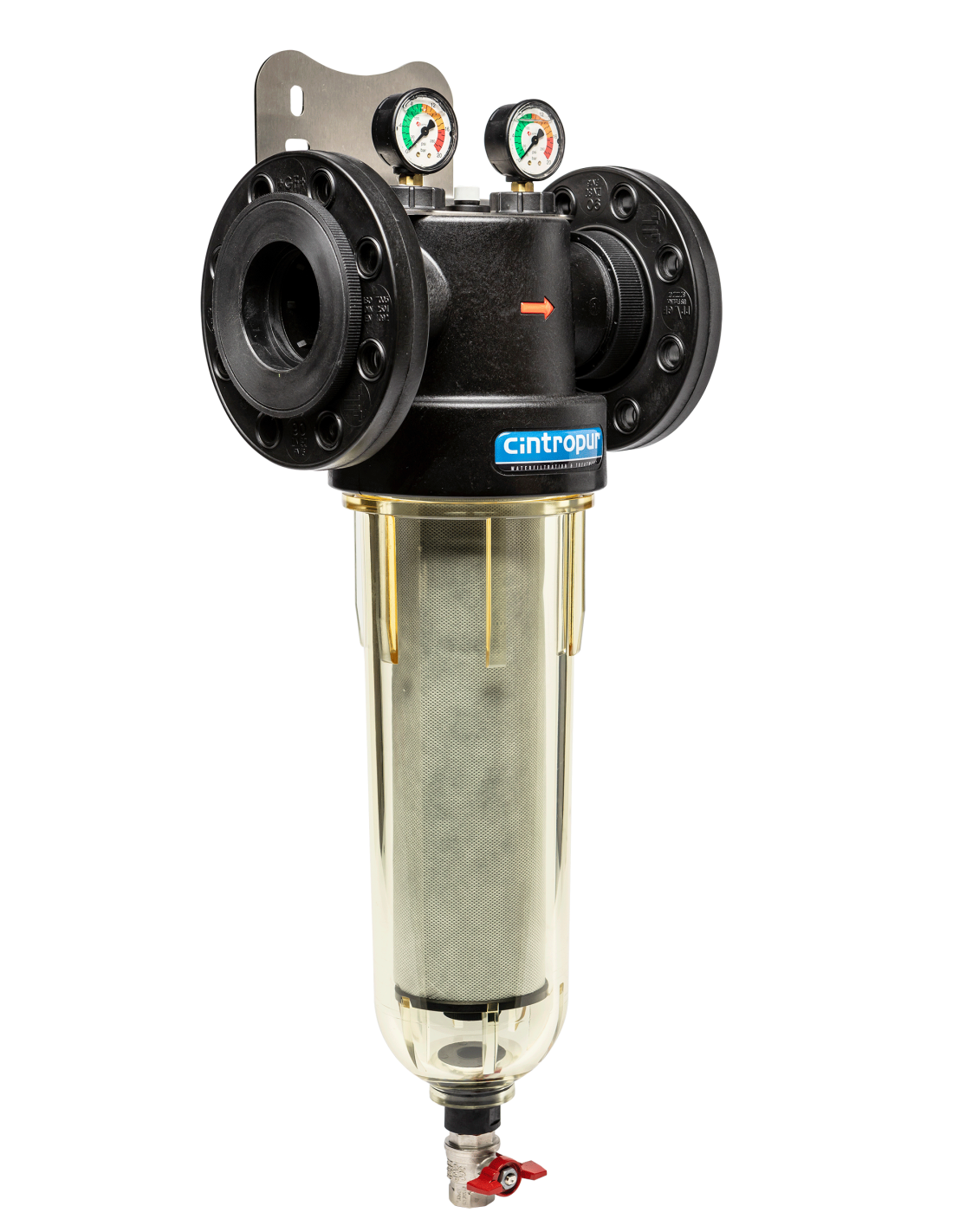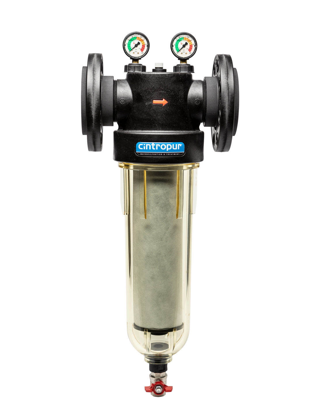 Filtre CINTROPUR NW800 en 3’’ à bride avec hélice qui transforme le flux d’eau en effet centrifuge par la précipitation des particules pesantes dans le bas de la cloche tandis que la manche filtrante assure la filtration finale suivant la finesse choisie.